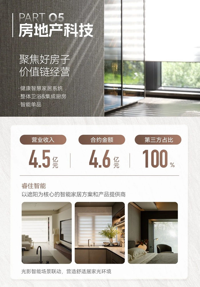 房地产科技:旗下睿住智能等板块表现亮眼,实现营业收入4.5亿元,且合约金额100%来自第三方市场,标志着其科技产品与解决方案已成功实现市场化突破。