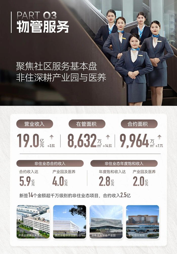 物管服务:营业收入增长至19.0亿元,在管面积突破8600万平方米。公司在稳固社区服务基本盘的同时,深化非住宅业态拓展,特别是在产业园与医养领域成果显著,新签多个千万级项目,相关合约收入达4.0亿元。