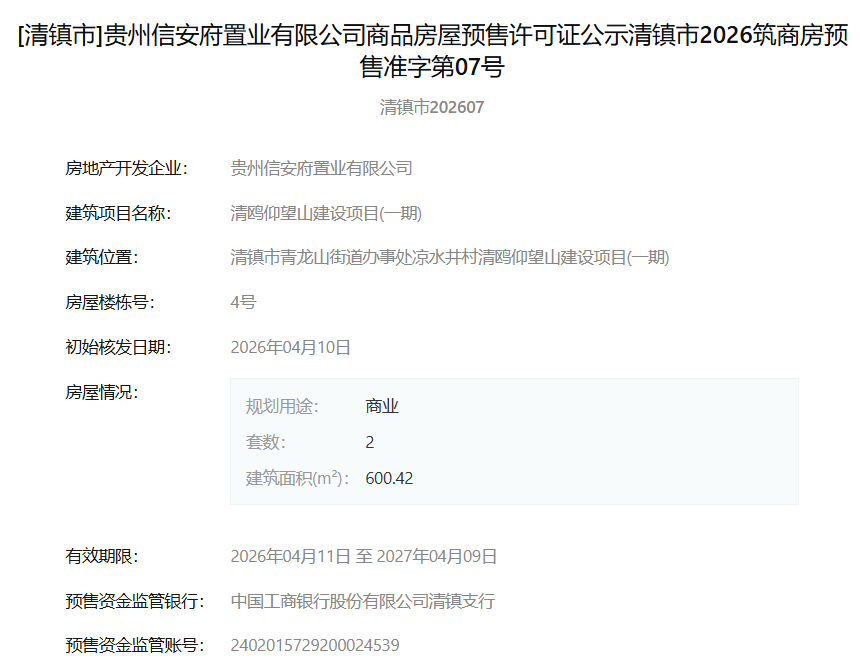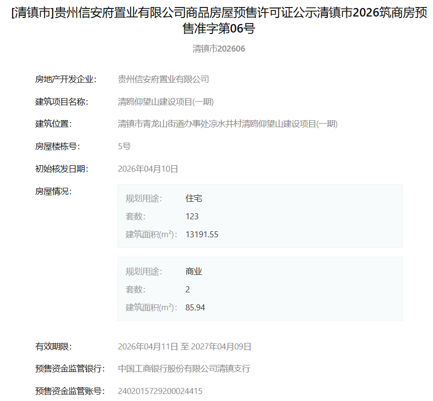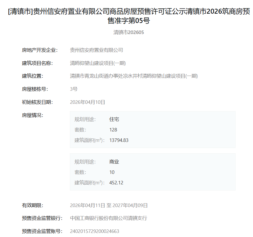根据公示信息,此次获得预售许可的楼栋为3号、4号及5号楼,许可证号分别为清镇市2026筑商房预售准字第05、07、06号,均于2026年4月10日核发,有效期至2027年4月9日。
